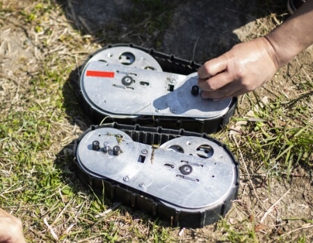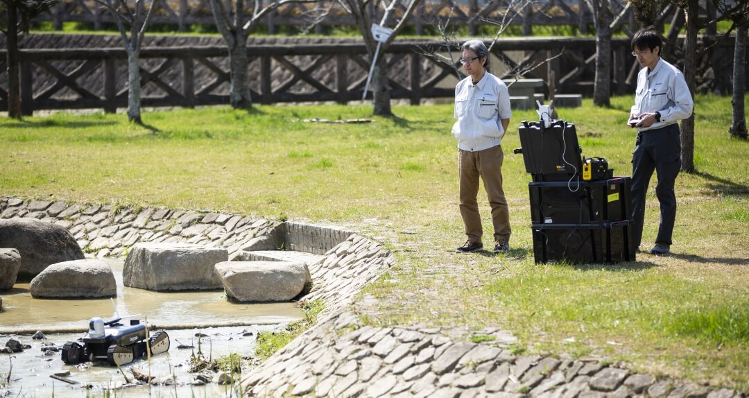 どことなく月面探査車を思わせるデザインの点検ロボットは、独特の電動モーター音を響かせながら、一面に石がころがる池の浅瀬を進んでいく。対岸で方向転換すると、石組みの護岸を駆け上がり、今度は人が出入りする階段へ。挨拶でもするかのように、ひょいと前足を持ち上げて、ゆっくりと階段を上っていく。無線でコントロールする操縦者の手には、見慣れたゲームコントローラーが握られている──