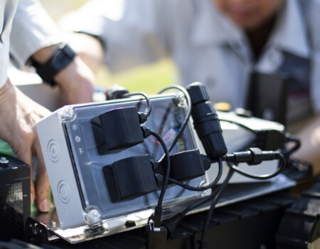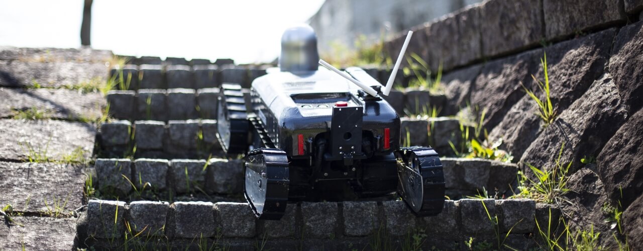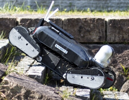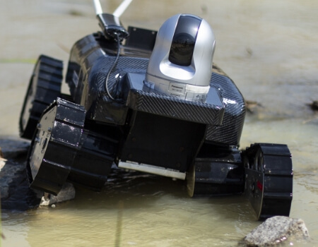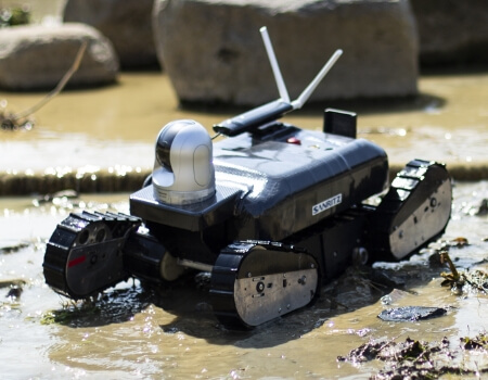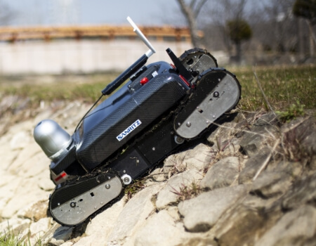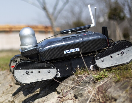 遠目にはラジコン模型のようでも、実物はかなりの大きさ。重量約25kgと迫力があるが、「1人で運べる」というコンセプトなので、これから、さらなる軽量化を図っていく。無線でコントロールできる距離は250m。有線でも操縦できる。記録用のフルハイビジョンカメラを備え、各種センサーの搭載に対応する。条件にもよるが、連続で3時間稼働し、7~8kmの走行が可能だ。